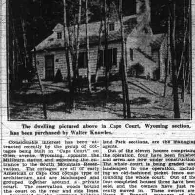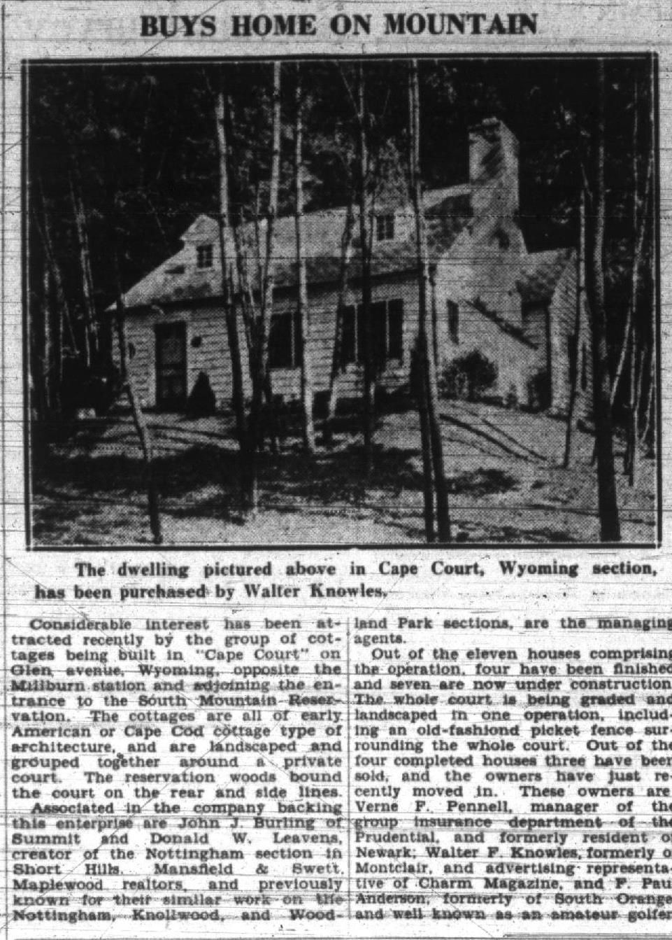 The Cape Court section of Millburn was constructed around 1929 and consisted of 11 Cape Cod Style houses landscaped and grouped around a private court bordering South Mountain Reservation. The development was backed by John J. Burling & Donald W. Leavens who were the creators of the Nottingham section. Mansfield & Swett were the managing agents.