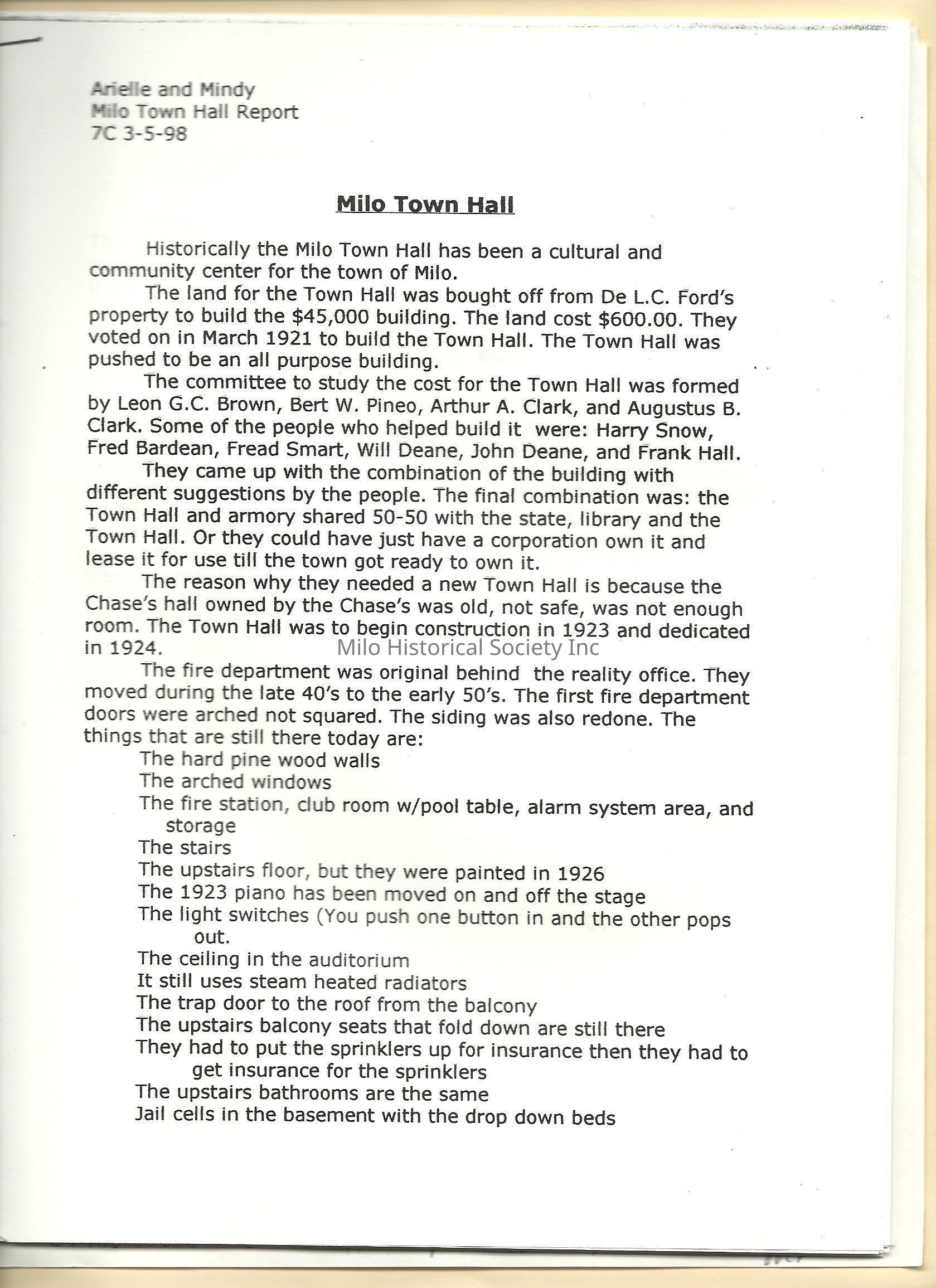 Milo Town Hall, Milo Theatre, Primary School, Bangor and Aroostook Railroad, Milo Fire Department, Milo Farmers Union, Ingall's Clothing Store, Chase Hall, American Thread Company, Milo Public Library, Dillon House, McFadyen Hospital, D"Este Mansion