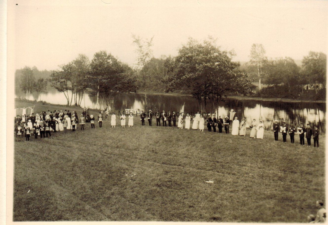1923 Centenniel Pageant on Piscataquis River Bank-Sign in picture says OES & Men on right are holding letter MFD (Milo Fire Dept.) Some men wearing the Knights of the Golden Eagle Uniforn - 3 copiesCollection