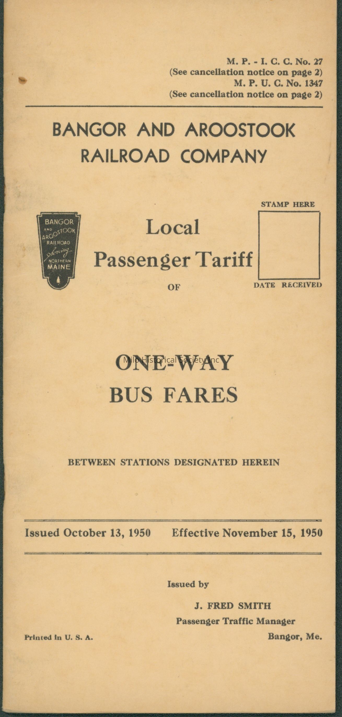 One Way Bus Fares for Bangor and Aroostook Railroad CompanyCataloged By