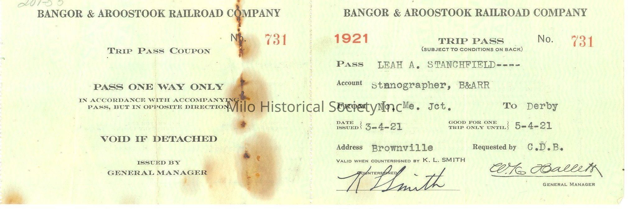 1921 B&ARR Pass for Leah StanchfieldCollection