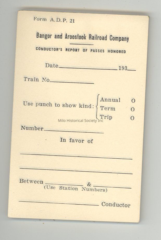 Bangor and Aroostook Railroad, BAR, B&A, Conductor's Report, Conductor's Report of Passes Honored, Bangor and Aroostook RRLocation