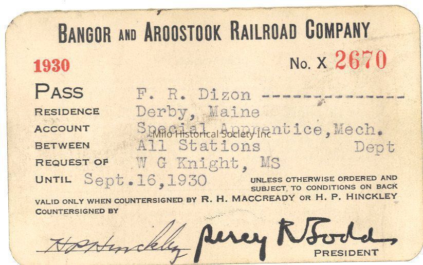Bangor and Aroostook Railroad, BAR, B&A, Pass, Bangor and Aroostook R RLocation