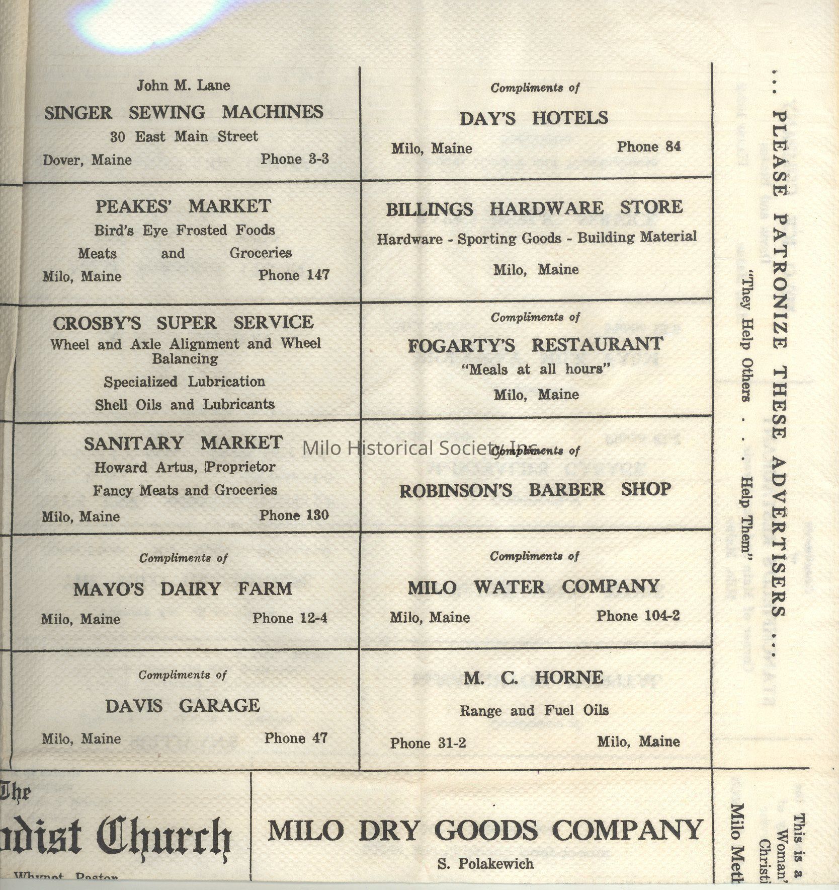 Milo Businesses, Milo Theatre, Gerrish and Gerrish Atty., Bumps Ins., Jerry's Place, Katahdin Country Club, Milo Land Co., First National Store, W. L. Doble Blacksmith, T & K, Mona Beauty Salon, Singer Sweing Machines, Peakes' Market, Crosby's Super Service, Sanitary Market, Mayo's Dairy Farm, Davis Garage, Day's Hotels, Billings Hardware, Fogartys Restaurant, Robinson's Barber Shop, Milo Water Co., M. C. Horne, Ralph Bragg Insurance, Milo Methodist church, Milo Dry Goods, A & P Store, American Thread, Ellingson's Garage, A. A. McKusick, Merrill Trust Co., Peter Pan Beauty Salon, Artus Garage, Jenkins Contractor, Milo Printing Co., Ricker's Dairy, West's Dairy, Sullivan's, Milo Greenhouse, A. L. Keniston, Milo Farmers Union, McNaughton Hosptial, Daggett's Drug, McDonald's Garage, Brockway Dairy Farm, Maine Public Service, Milo IceCo., Stanchfield's Restaurant, Durgin Villani Law, Dillon House, Kerr'ws Repair Shop, Leonard's Luncheonette, Karp's Store, Owen Drug Co., Pullen's, Pineo's Store, Charles Mills Ins.