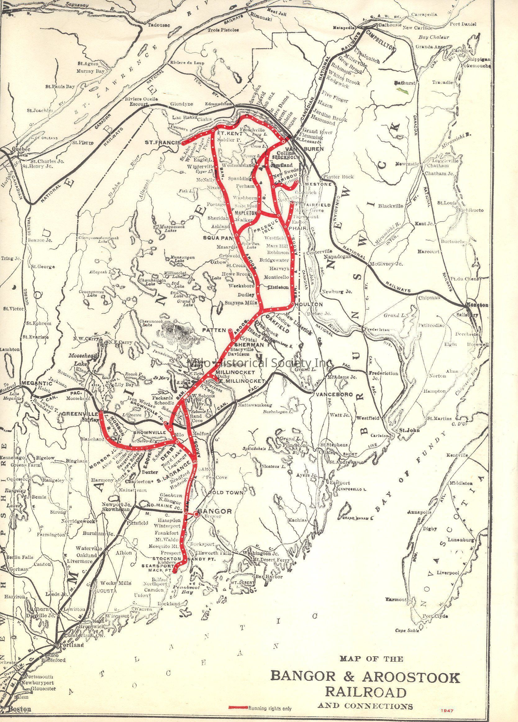 Map showing Bangor and Aroostook Railroad and connections in 1947