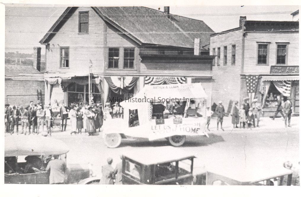 A. A. Clark Furniture Float in Centennial Parade 1923 - Shows Peakes Mkt. & A.&P. Store behind it