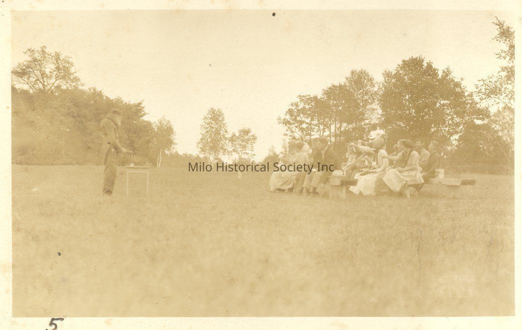 Centennial Pageant - Man standing in front of people sitting on bench first school