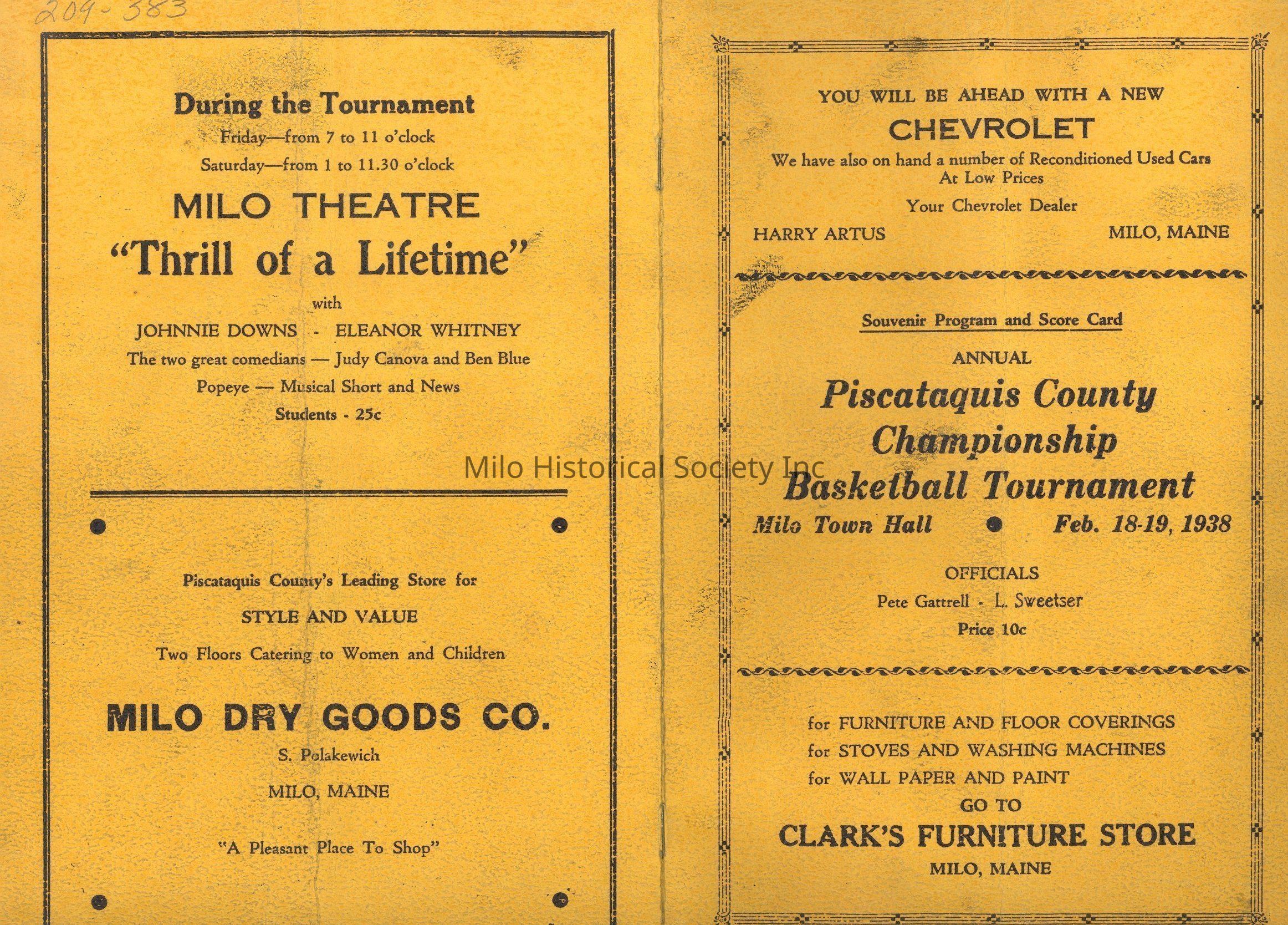 Piscataquis County Championship Basketball, Harry Artus Chevrolet, Arthur A. Clark Furniture, First National Stores, Karps, Taylor's Gulf Station, Pullens, Purdy's, Jerome Clark, Atty., Maine Public Service, Peakes' Market, Thurston & Kingsbury Store, American Thread Co., Dillon House, M. M. Knowles, Fogarty's Restaurant, H. C. Cowing's, R. C. Turner Barber, Ellingson's Garage, A & P Store, Peter Pan Beauty Salon, Jerry's Place, Glenn's Lunch, R. A. Moores, Daggetts, Danforth's Restaurant, Milo Printing, M. C. Horne, Milo Water Company, E. H. BArrett, Optometrist, Titus Jewelry, McDonald's Garage, Sanitary Market, Sullivan's, Milo House, Marjorie Beauty Shoppe, Farmers Union, McKusick's, Crosby's Super Service, R. M. Ingalls Clothing, Milo Theatre, Milo Dry Goods, Piscataquis County Championship Basketball Tournament, Clarks Furniture, Karp's, H. M. Pullen, Jerome Clark Attorney, Maine Public Services, Peakes Market, The American Thread Co., R. C. Turner barber, Davis Garage, The Great Atlantic & Pacific Tea Co., R. A Moores, Daggett's Drug Store, Ben Franklin Store, Milo Printing Co., Milo Water Co., Dr. E. H. Barrett, Optometrist, Titus Jewelry Store, THe Milo Hotel, The Marjorie Beauty Shoppe, Milo Farmer's Union, A. A. McKusick, Milo Dry GOods Co.