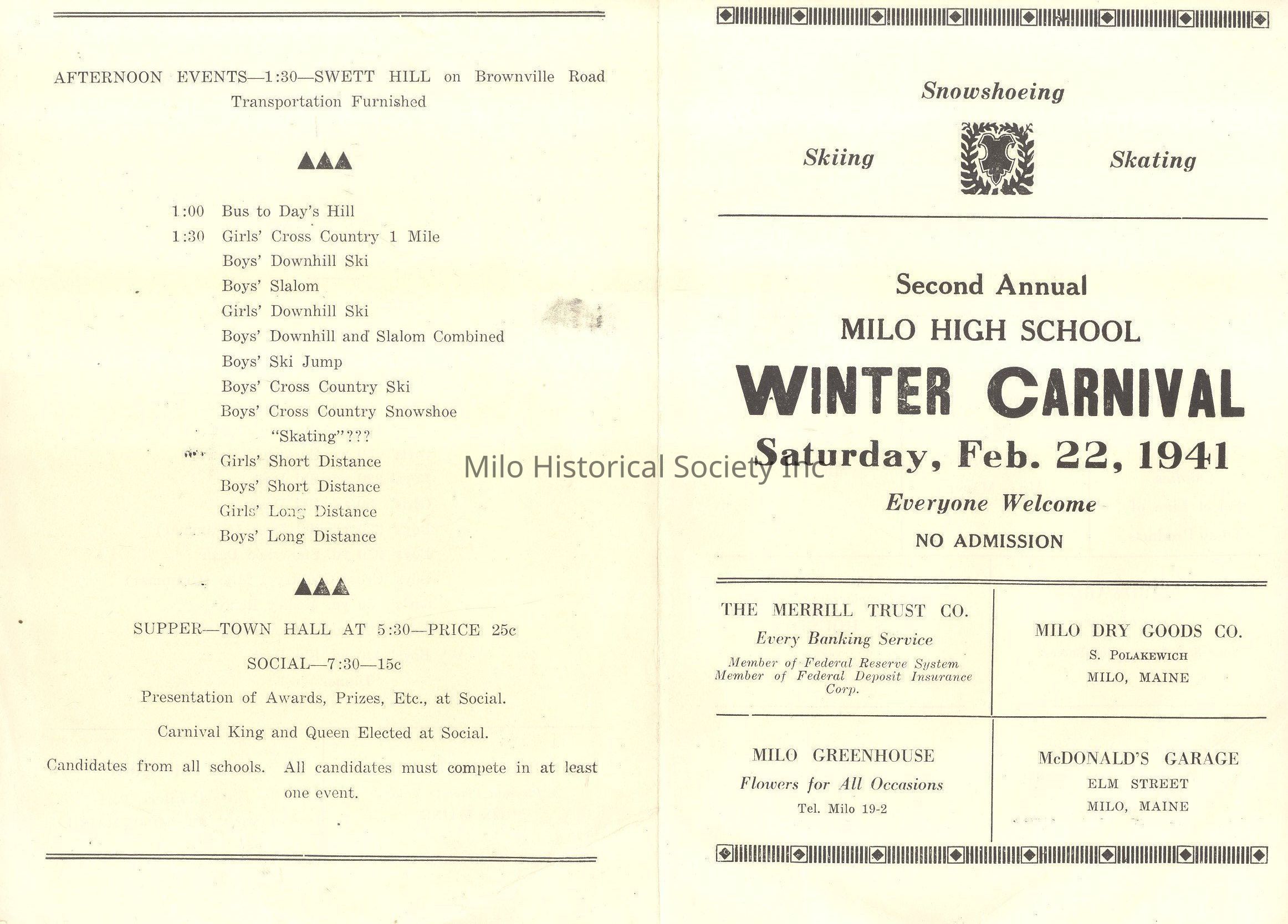 Winter Carnival 1941, Milo High School, Merrill Trust, Milo Dry Goods, Milo Greenhouse, McDonald's Garage, Karps, M. C. Horne, Billings Hardware, Milo Land Co., Leonard's, American Thread Co., T & K Store, Allen Hardware, Daggetts, Pineo's, A & P Store, First National Store, Peakes, Guy Monroe Painter, The Merrill Trust Co., Karp's Mens Shop, T. & K. Store, Allen Hardware Co., Daggett's Drug Store, Pineo's Dry Goods, A. & P. Store, Peake's Store