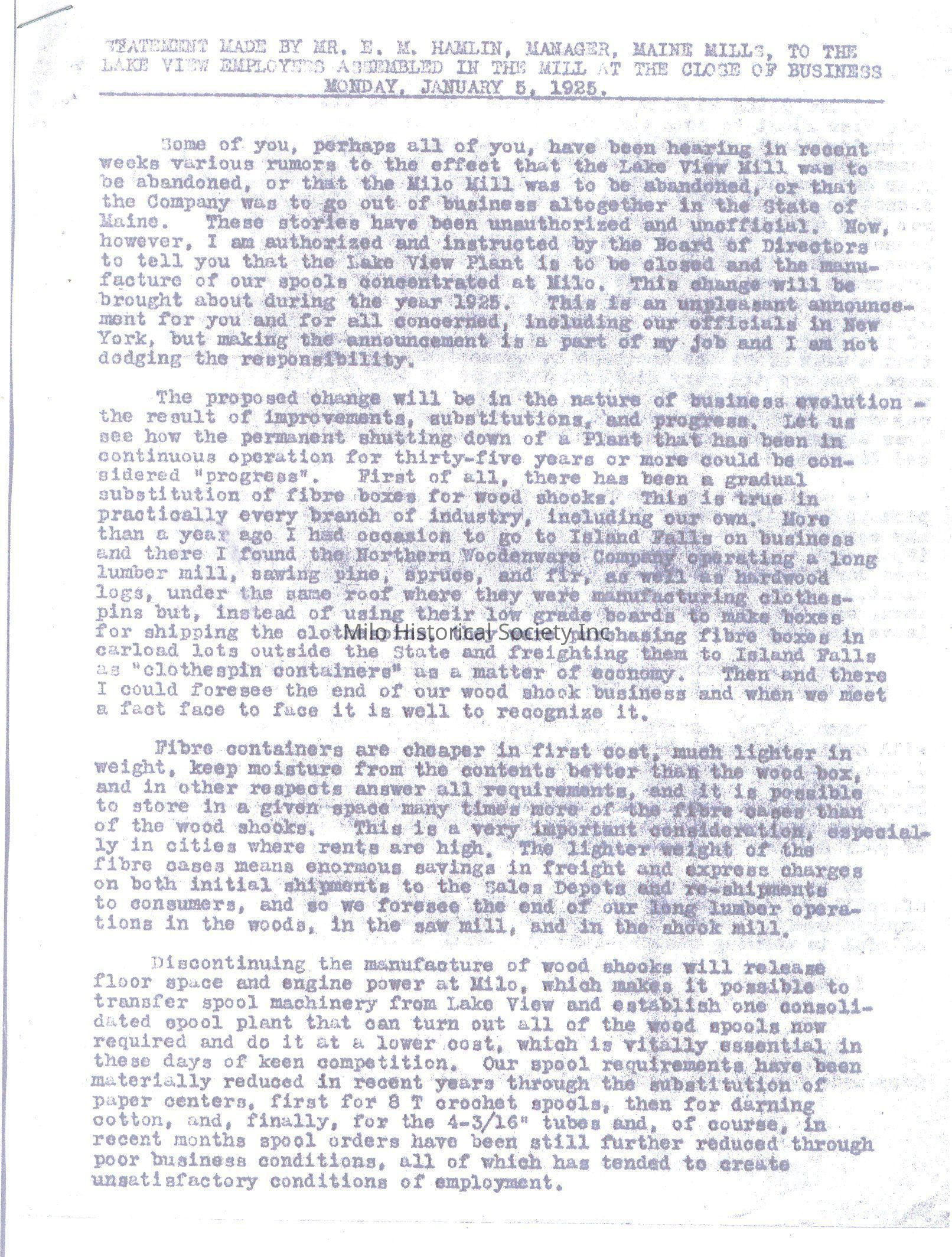 Copy of Speech by Edwin M. Hamlin given to employees in Lakeview about American Thread moving to Milo.Cataloged By