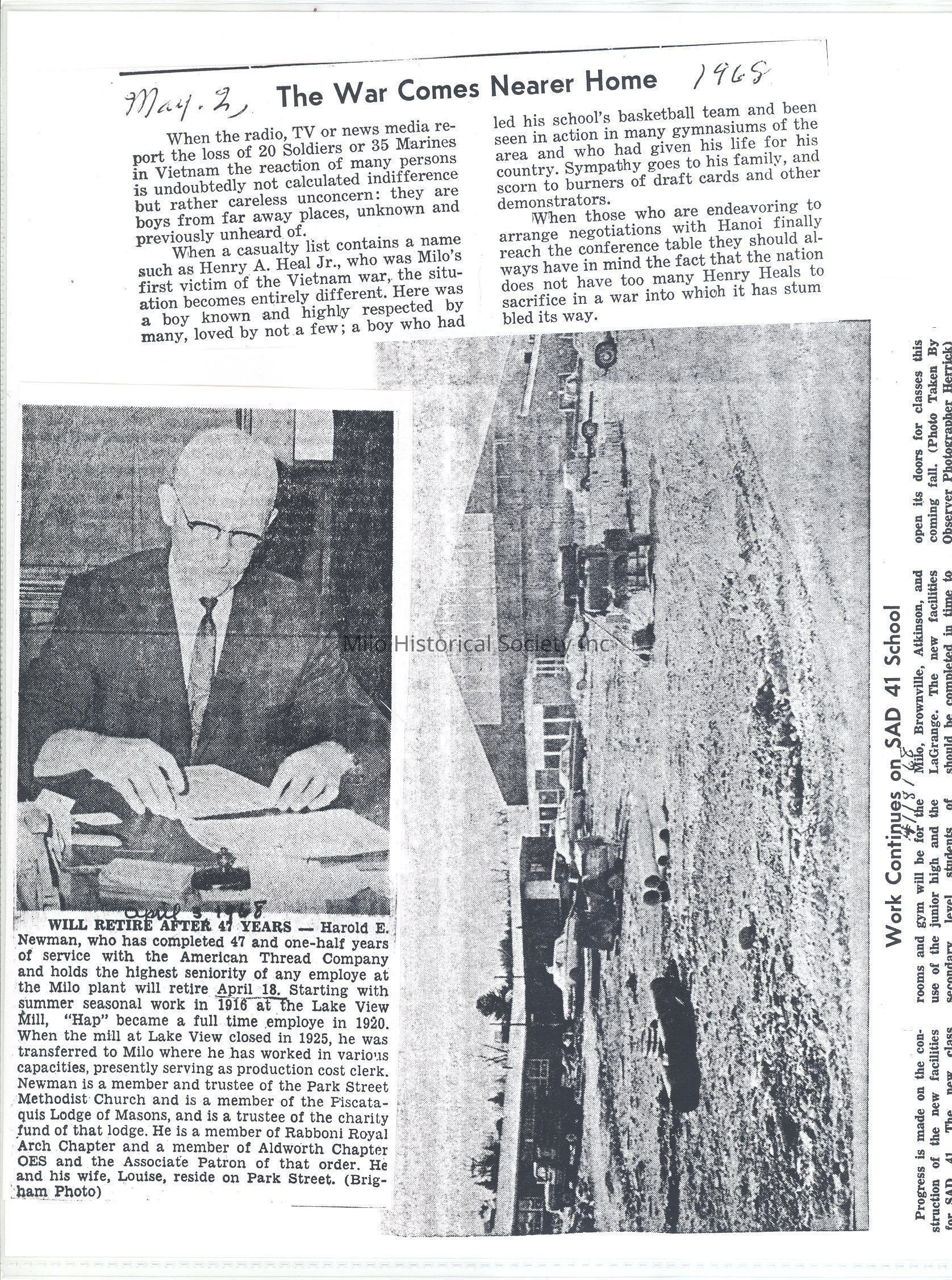 Henry Heal casualty of war Work continues on Penquis Valley High School Harold Newman retires