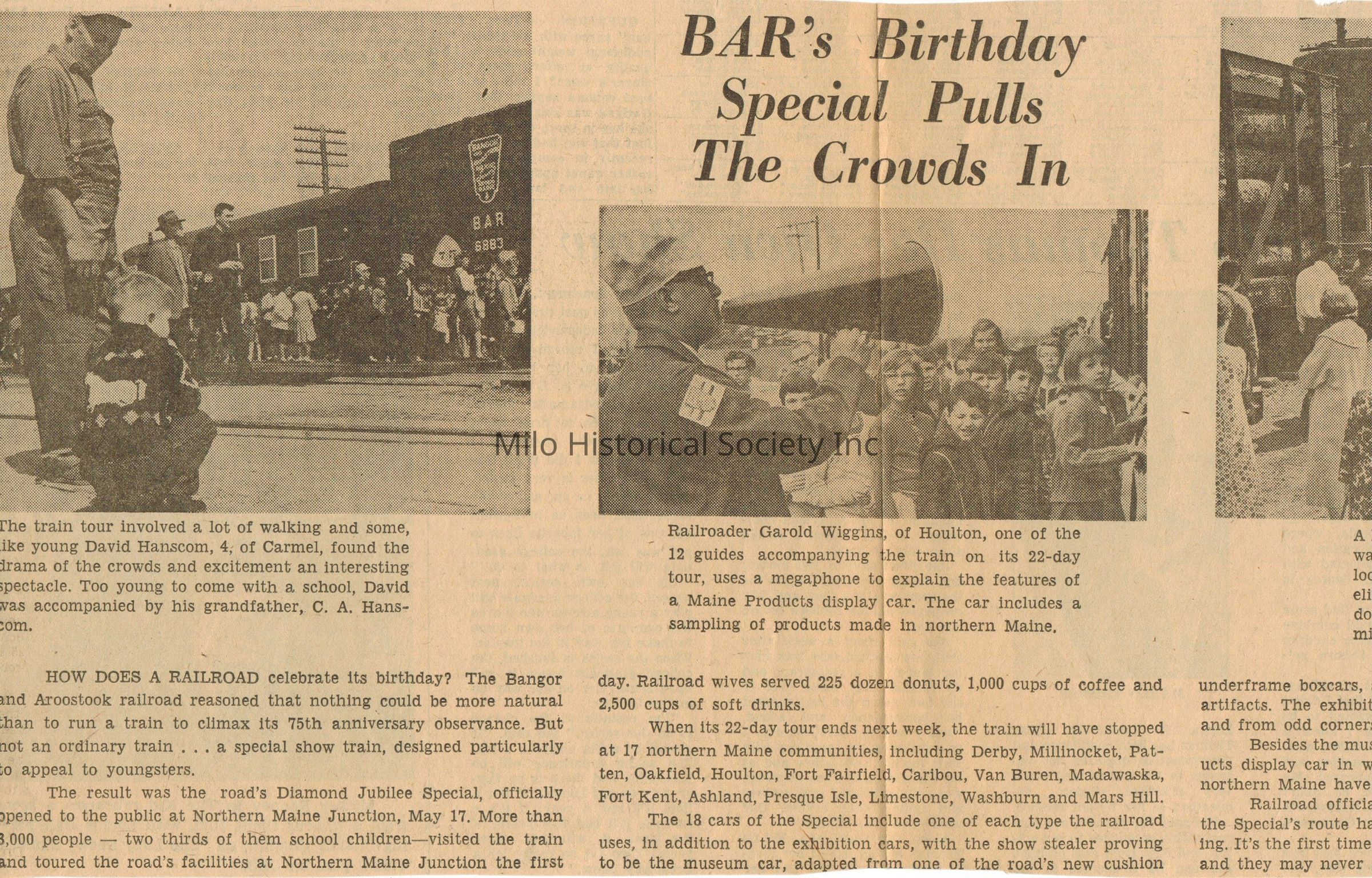 Article from the Bangor Daily News about the Bangor and Aroostook Railroad's birthday Special.