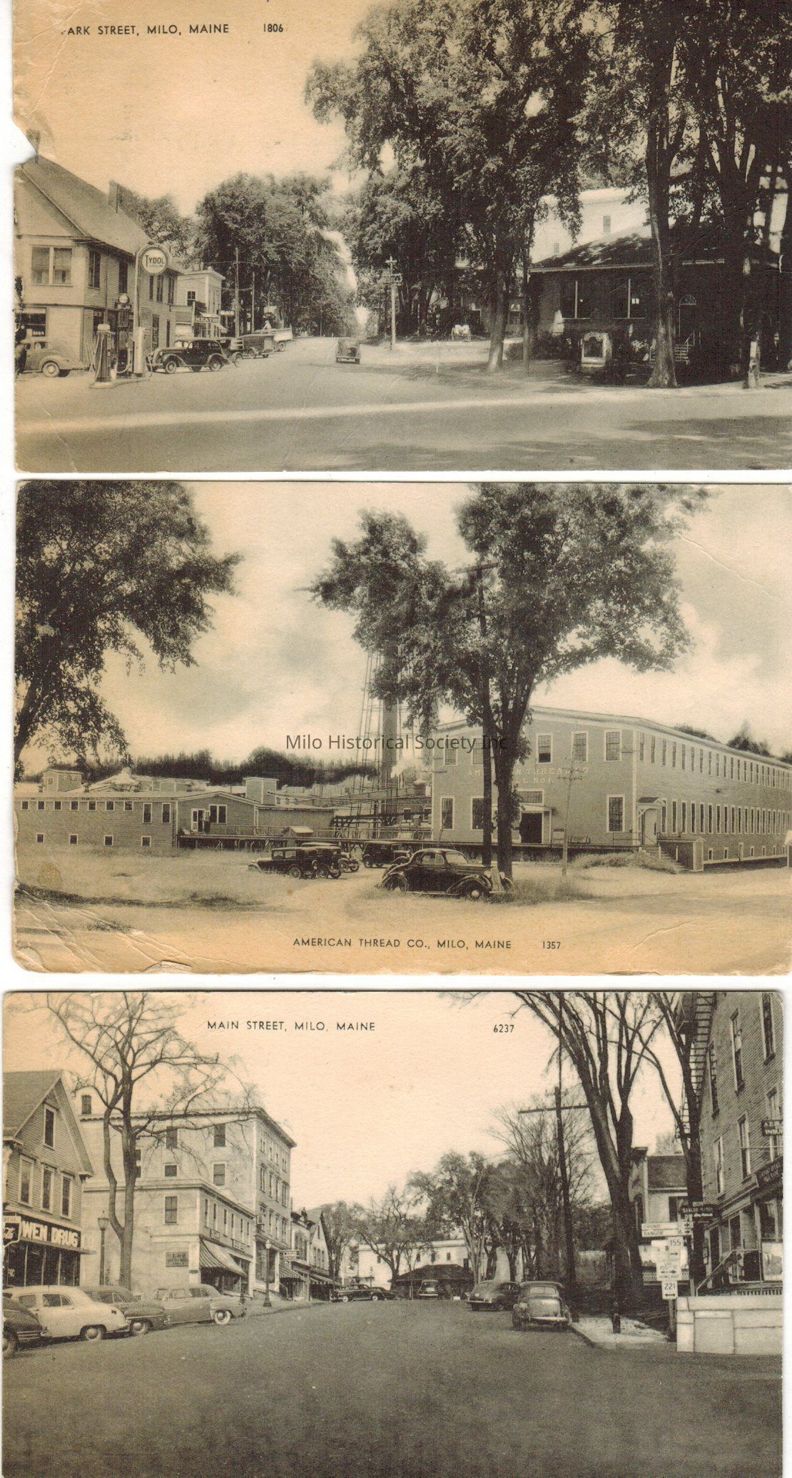 3 old photos of Milo: Park Street and the Library, American Thread Co. and Main Street. They are all postcards.Collection