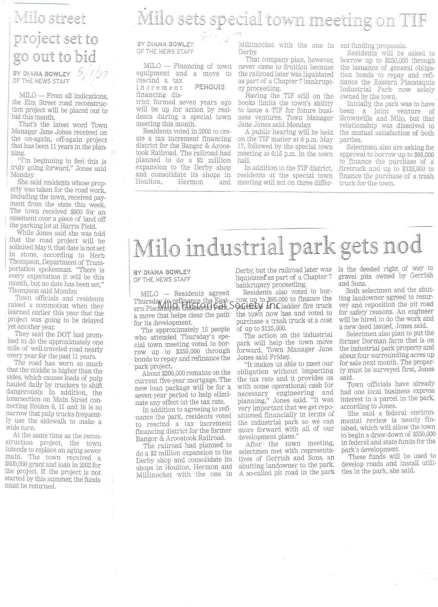 Elm Street Reconstruction, Tax increment Financing District, Industrial Park, Eastern Piscataquis Industrial Park, Bangor and Aroostook Railroad, BAR, B&A, Elm Street reconstruction, Tax Increment FInancing District, Bangor And Aroostook Railroad