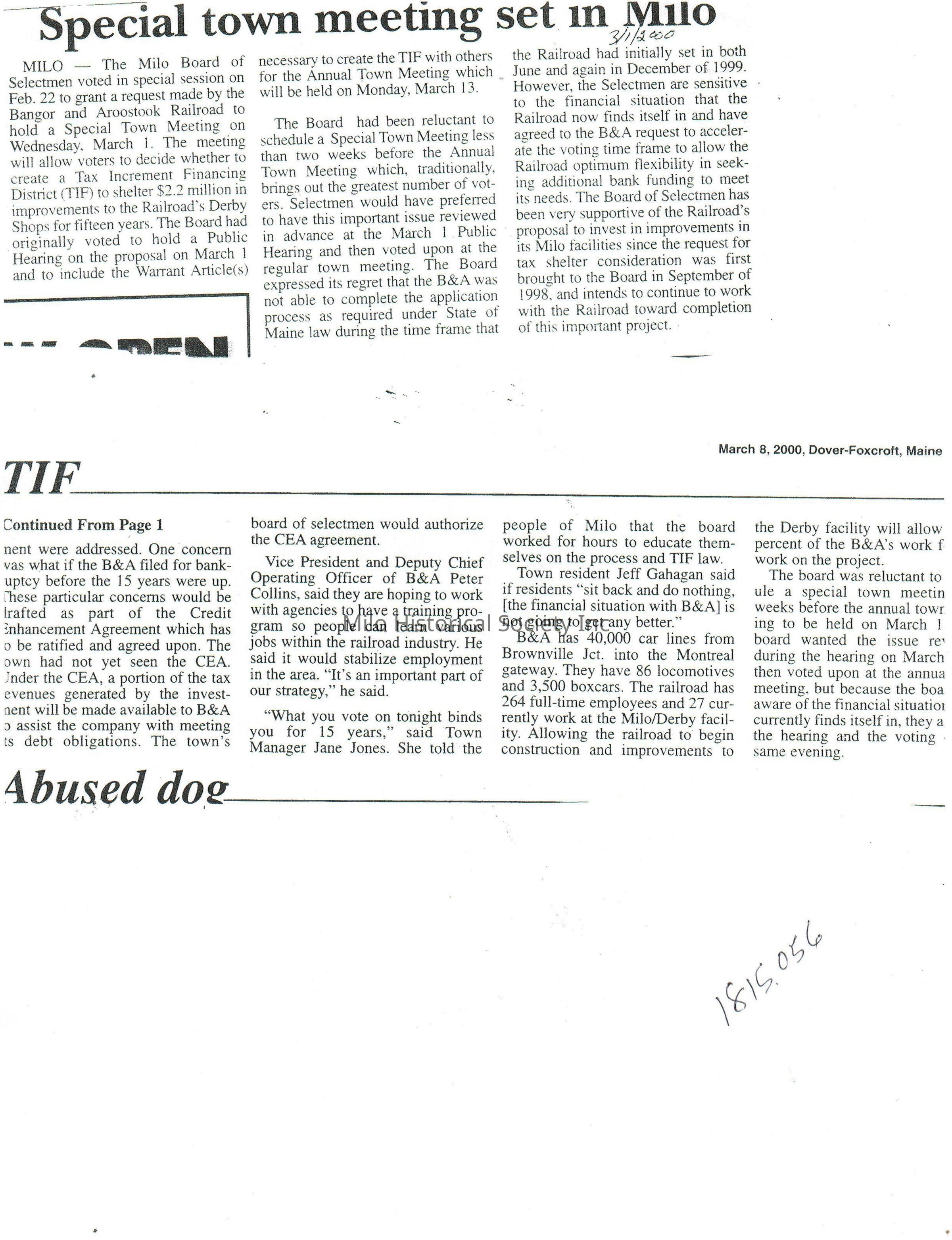 Special Town meeting about request from Bangor and Aroostook Railroad for a TIF
