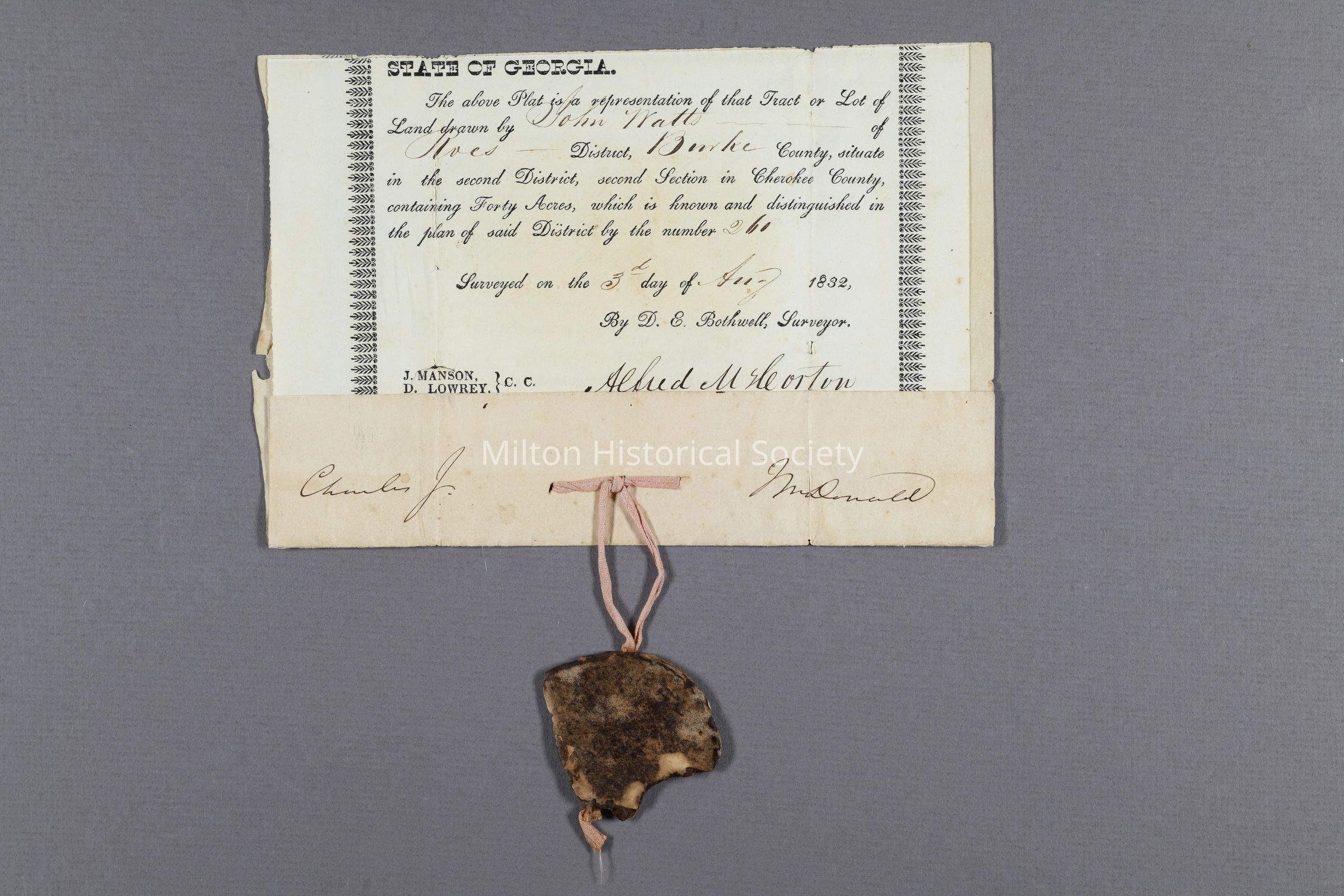 Bottom segment of land grant deed to John Watts signed in 1843 including portion of wax seal. Land lot number 260. Surveyed in August 3, 1832 and granted via this deed July 1, 1843. At the time of the land grant, the parcel was part of Cherokee county. This deed (Lot 260) is pictured in multiple accessions as segments A through E.Context