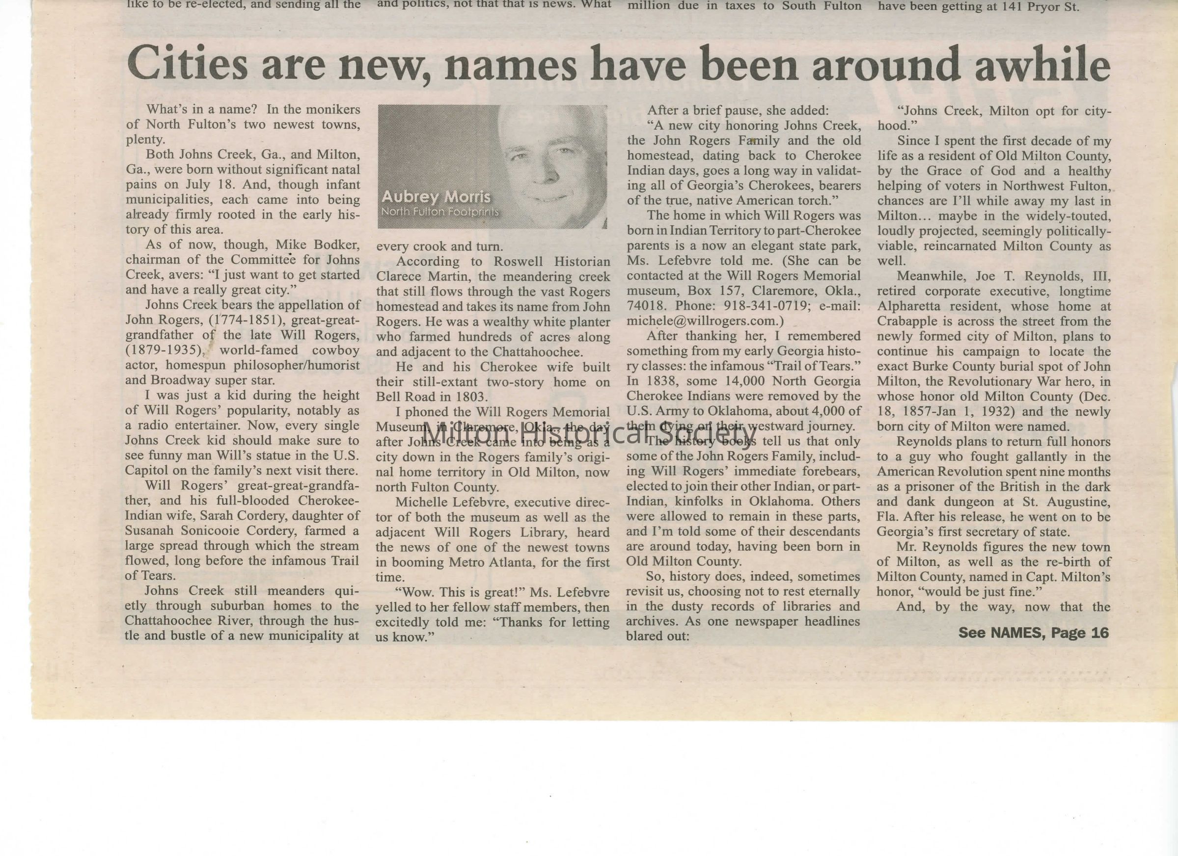 Article describing the creation of two new cities, John's Creek and Milton, in North Fulton County, GeorgiaContext