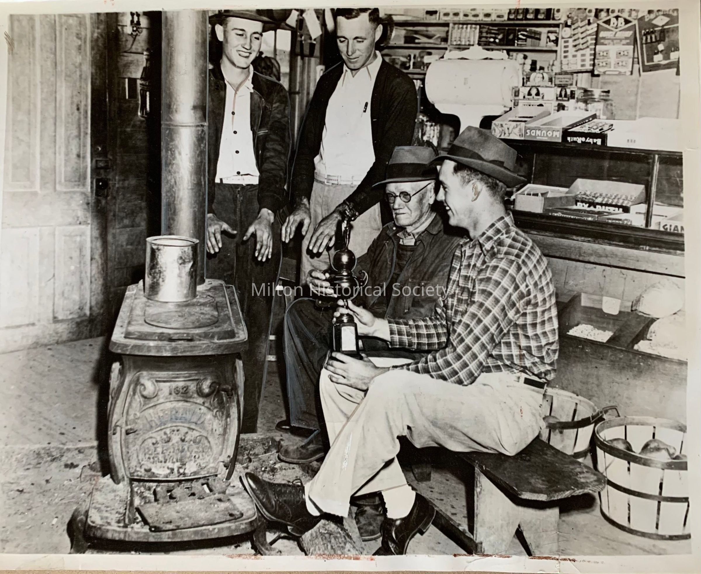 Photo of Johnny Rucker in Crabapple store who at the time of photo in January of 1940 is a New York Giant outfield recruit. He is in the checkered shirt holding one of his trophies. With him to the left are W.S. Broadwell, Elbert Rucker and A.C. Holcomb. Back of photo notes that at the time Crabapple had a population of 60.Context