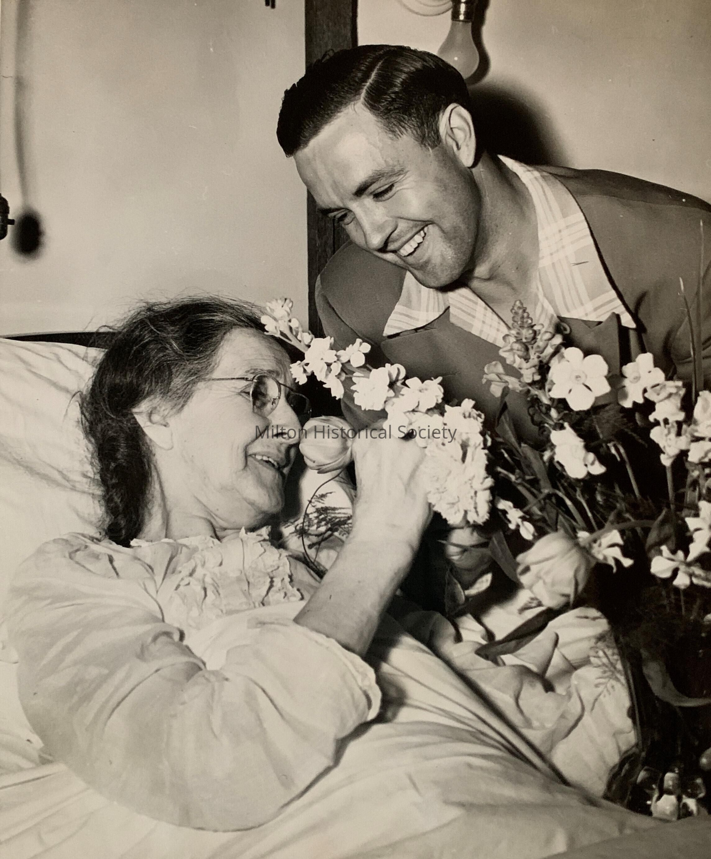 Johnny Rucker, Center Fielder for the New York Giants takes flowers to his mother, who is in Atlanta with a fractured hip. Rucker informed Manager Mel Ott of the Giants he would be late reporting for spring training because of his Mother's condition. He lived on a farm near Atlanta at the time.Collection