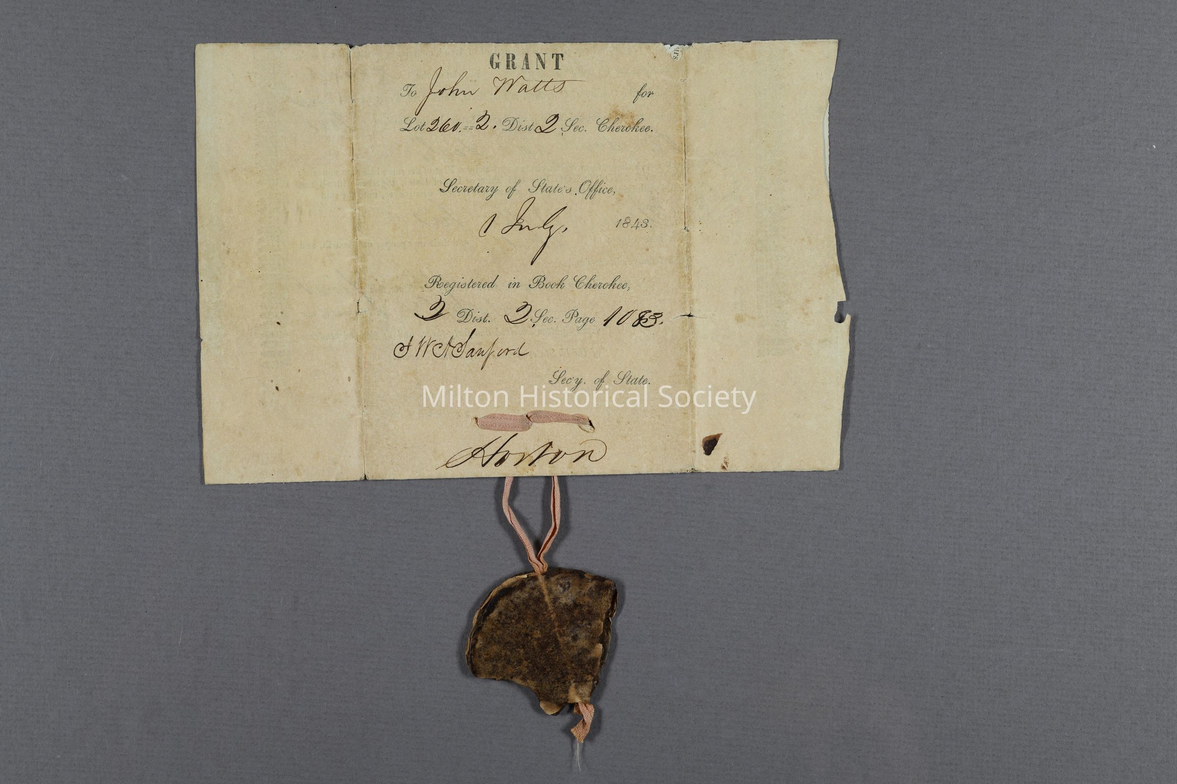 Fifth of five segment photos of land grant deed to John Watts signed in 1843. Land lot number 260. Surveyed in August 3, 1832 and granted with this deed in July 1, 1843. At the time of the land grant, the parcel was part of Cherokee county. This deed (Lot 260) is pictured in multiple accessions as segments A through E.Context