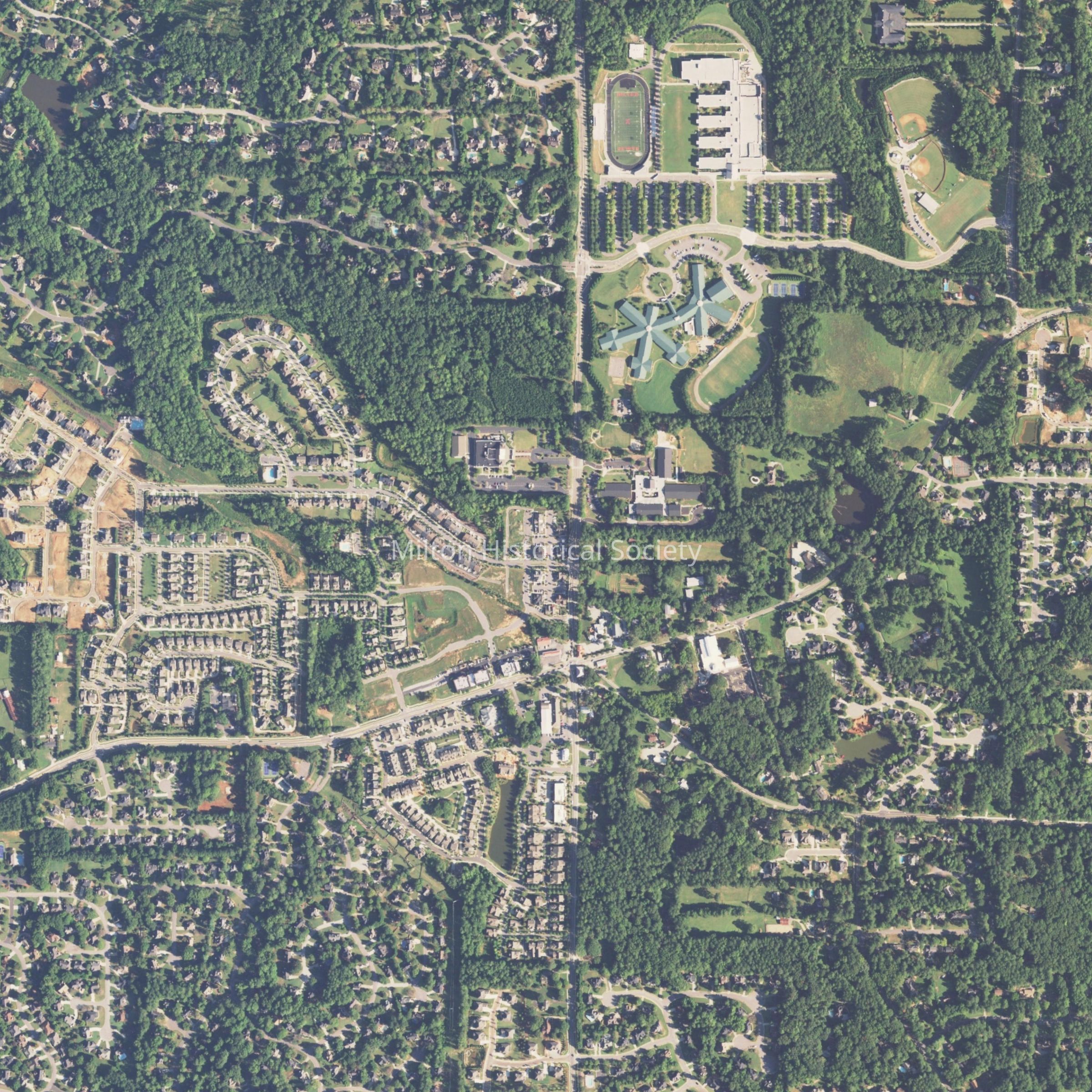 Compared to the prior photos in the series, development west of Birmingham Hwy/Broadwell Road has been added to substantially. This west side of Crabapple now has shops, restaurants, commerical space and single family homes. The Milton Library opens in 2015, seen here at the corner of Mayfield and Charlotte Roads. The photo is copyrighted. The right to use/view only via the Society site has been granted by Historical Aerial Photos / NETRonline.comCollection