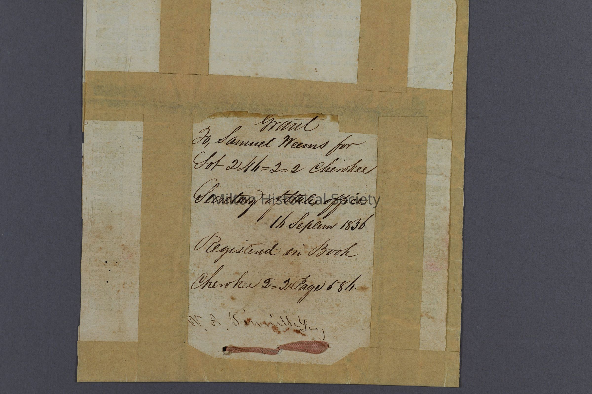 Outside cover page of deed to Samuel Weems for lot 246.Collection