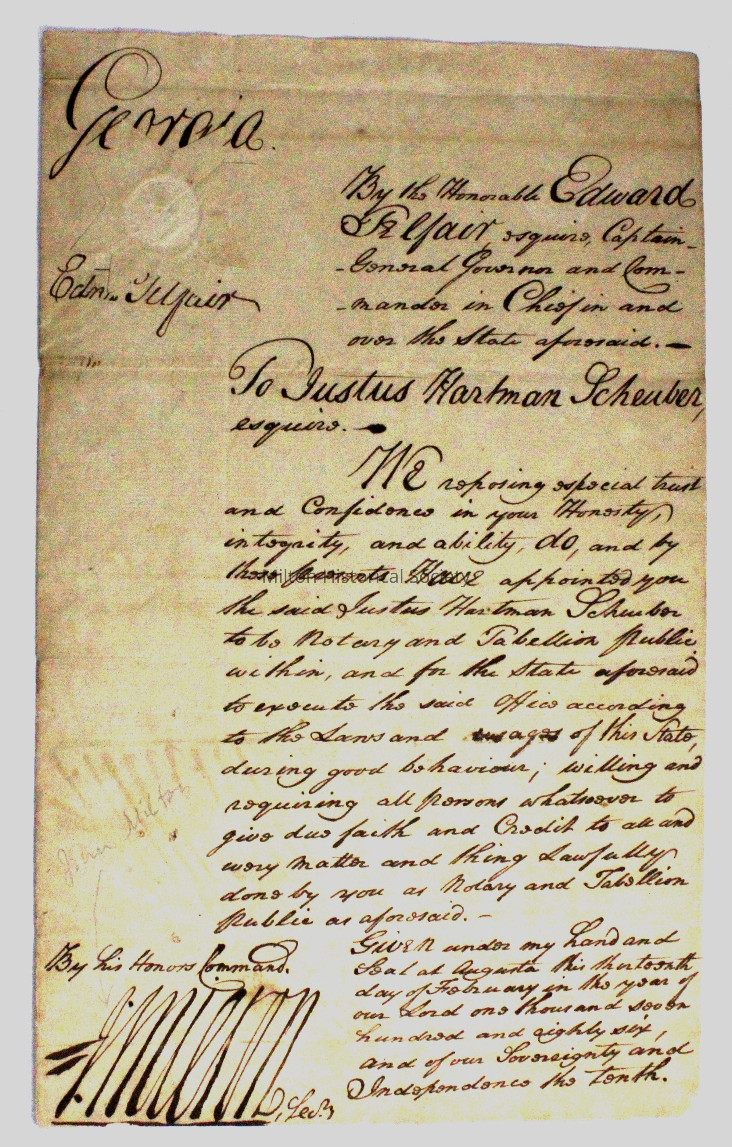 Official correspondence from the office of the Governor of Georgia Edward Telfair. Dated February 13, 1786 and signed by Secretary of State, John Milton. The letter appoints Esquire Justus Hartman Scheuber to the rank of Notary and Tabellion for the state. In 1785, Georgia had passed a law requiring that deeds be recorded in the county where the property was located. It is believed this rank allowed him to certify land deeds.Collection