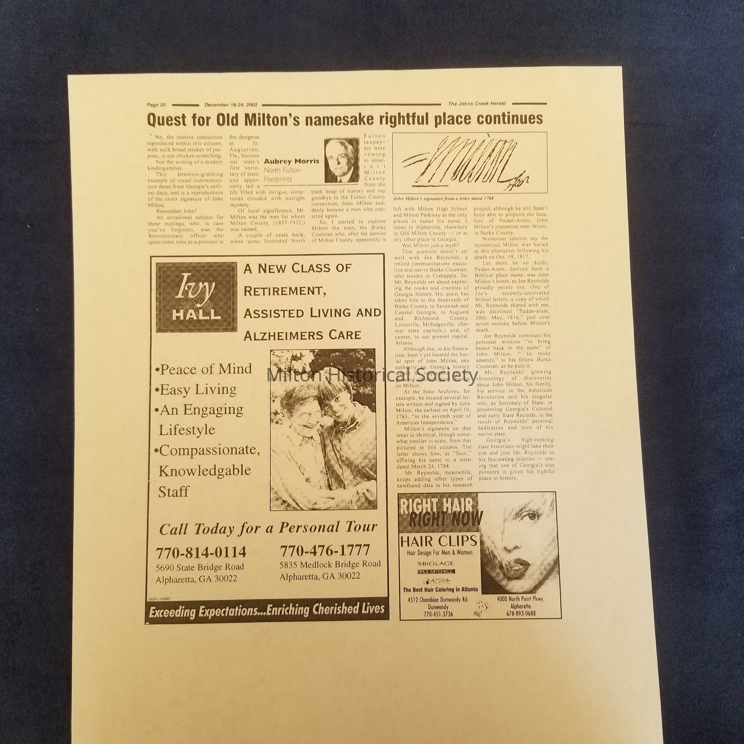 Joe Reynolds, a Milton resident, researches the life and legacy of John Milton, Georgia's first Secretary of State. Mr. Reynolds has uncovered letters written by John Milton showing his signature. He has also found details of his birth and miliary history. Still unknown is the location of his plantation, Paden-Aram, where he is thought to be buried.Collection