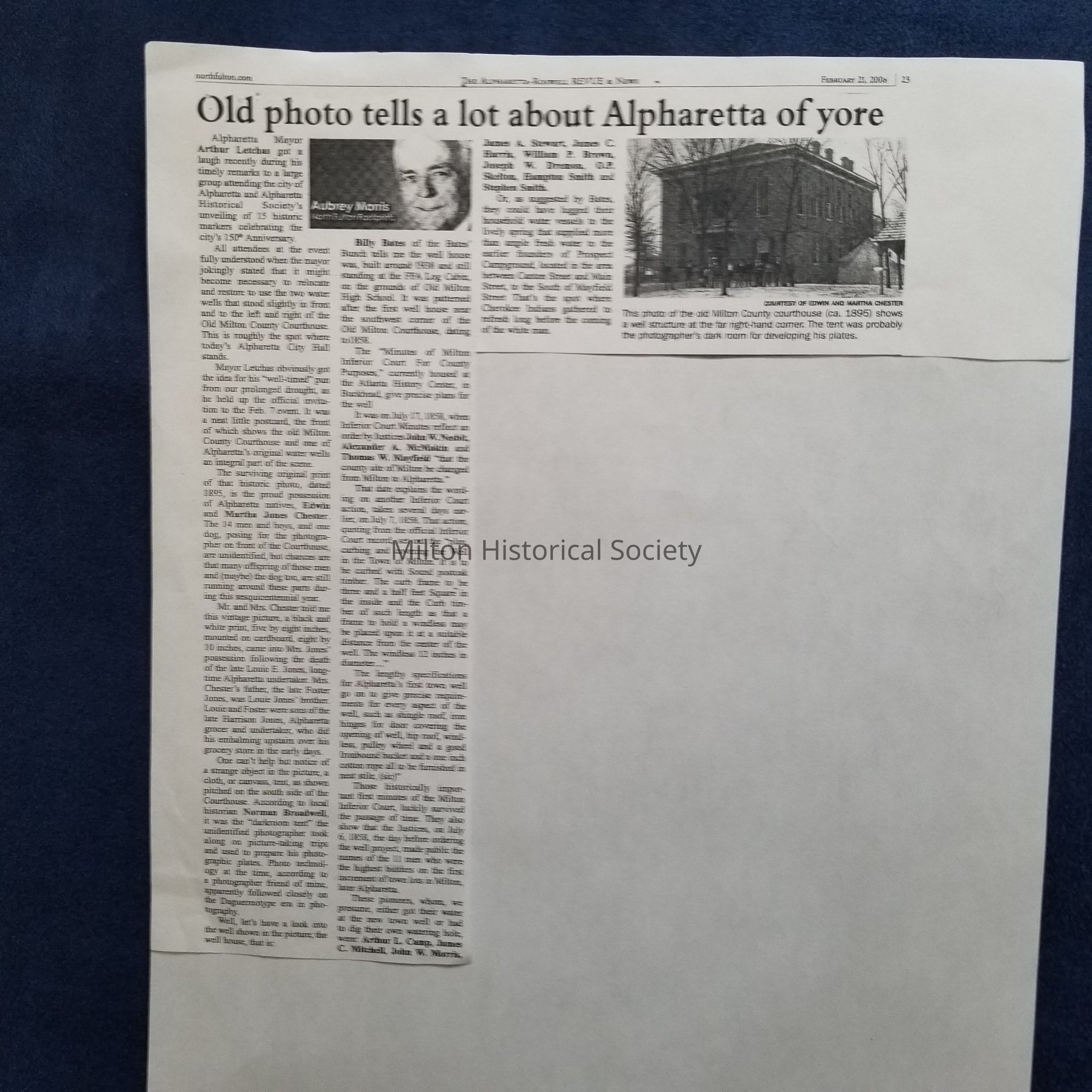 A photograph and description of Alpharetta's first town well as found in the first minutes of the Miton Inferior Court of July 17,, 1858. Fresh water from the spring supplied Prospect Campground, the same spot where Cherokee Indians gathered to refresh long before the coming of the white man. The minutes also show the names of 11 men who were the highest bidders on the first increment of town lots in Milton, later Alpharetta.Collection
