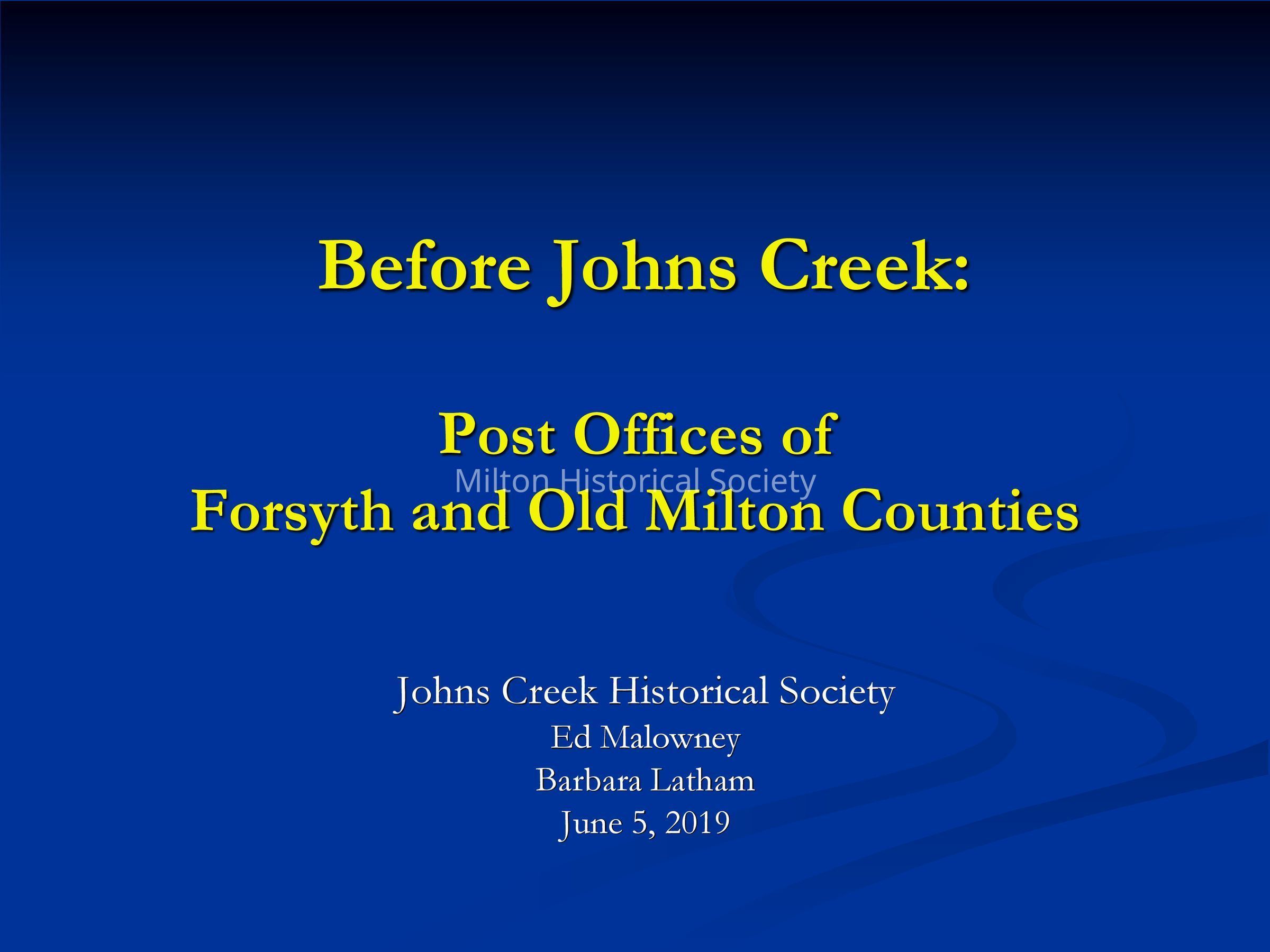 History of the post offices of Old Milton and Forsyth Counties prior to Johns Creek.Context