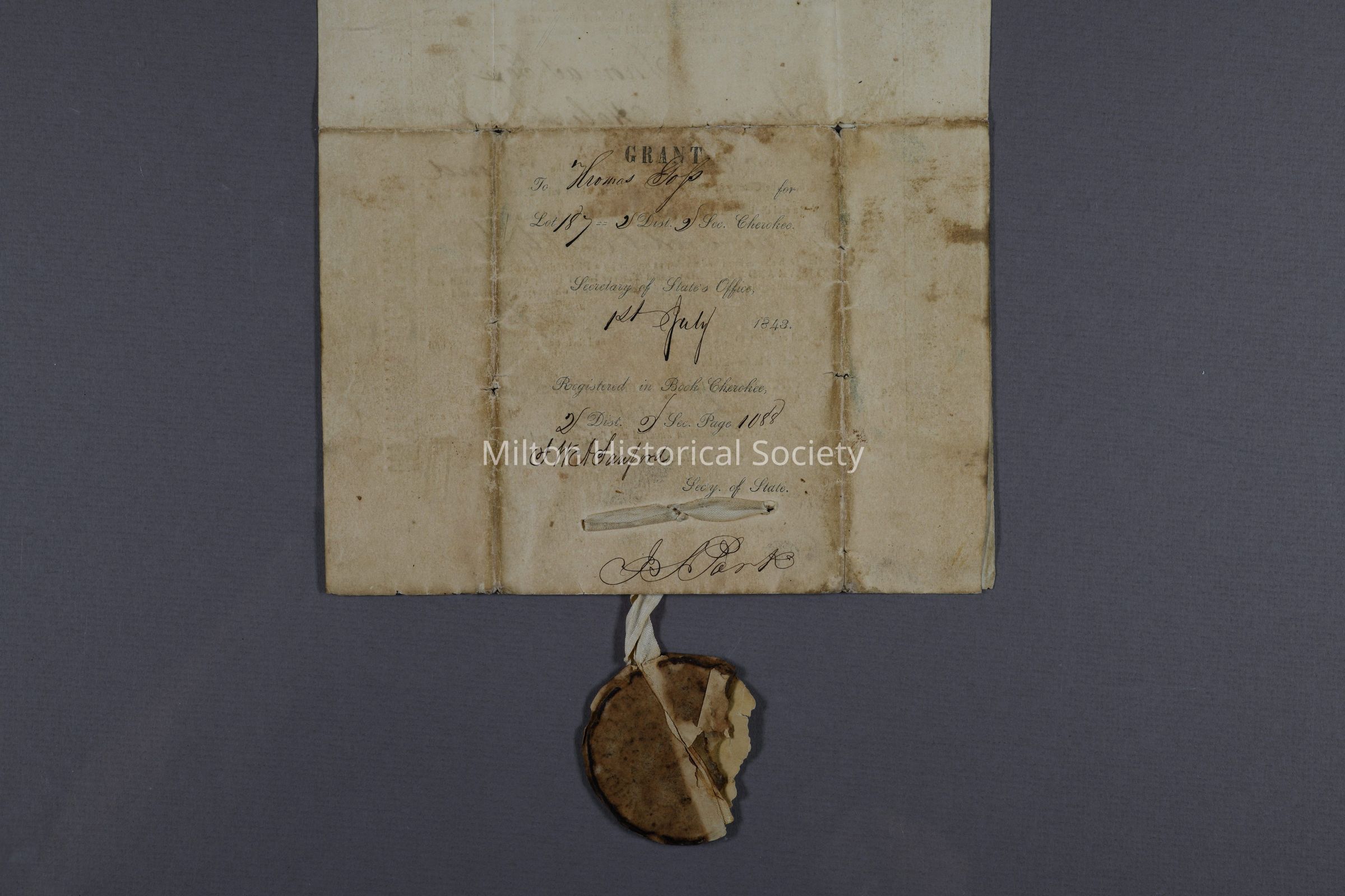 District 2 Section 2 Deed and wax seal granting 40 acres to Thomas Gofs from the Georgia Land Lottery of 1843. Land that is now in the city of Milton was at the time Cherokee County.Context