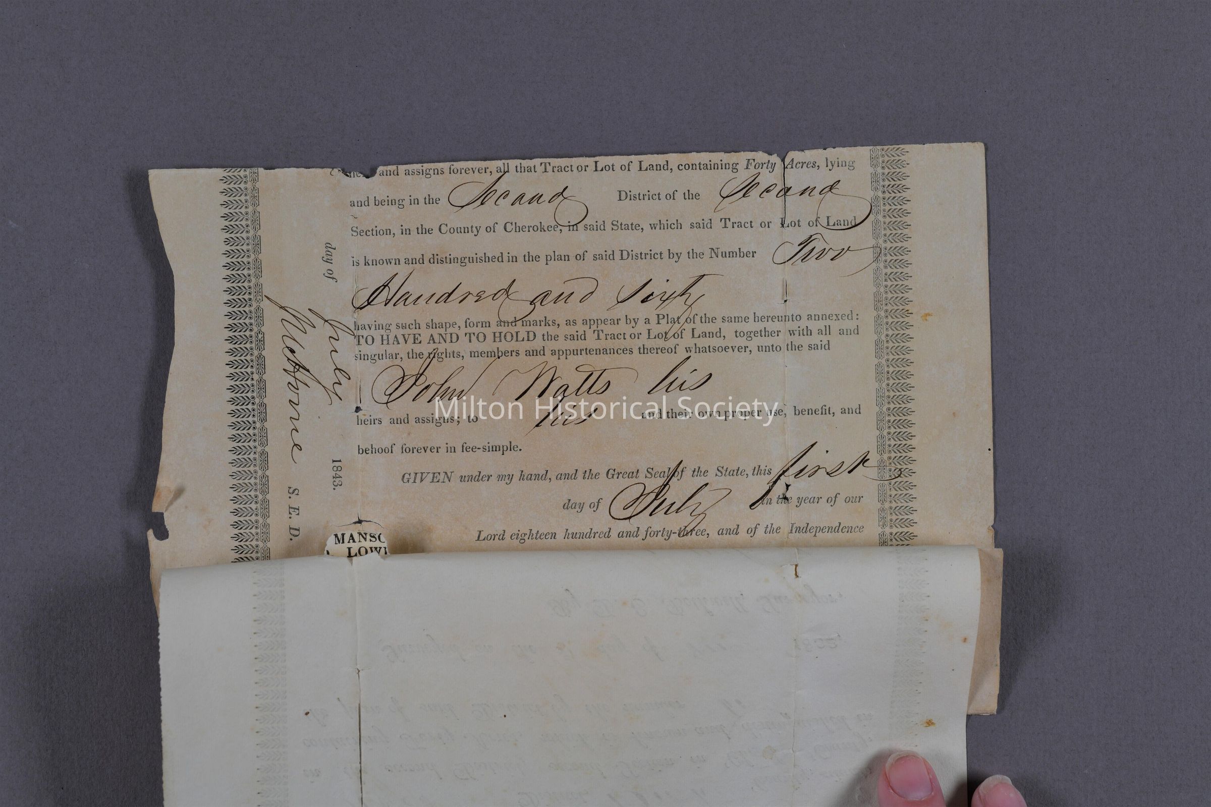 The fourth of five segments of a land grant deed to John Watts signed in 1843. Land lot number 260. Surveyed in August 3, 1832 and granted with this deed in July 1, 1843. At the time of the land grant, the parcel was part of Cherokee county. This deed (Lot 260) is pictured in multiple accessions as segments A through E.Context