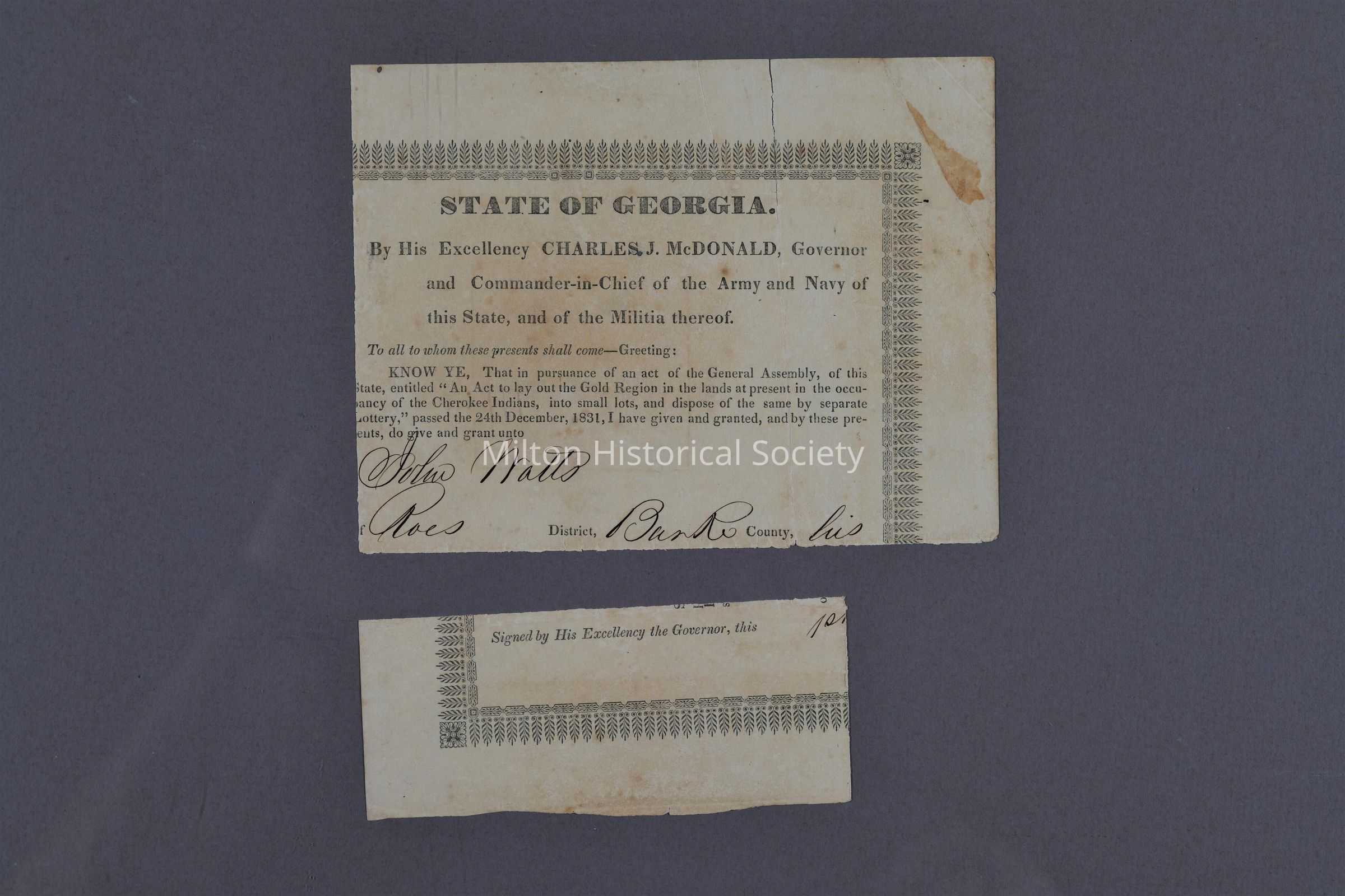 Third segment of land grant deed to John Watts signed in 1843. Land lot number 260. Surveyed in August 3, 1832 and granted with this deed in July 1, 1843. At the time of the land grant, the parcel was part of Cherokee county. This deed (Lot 260) is pictured in multiple accessions as segments A through E.Context
