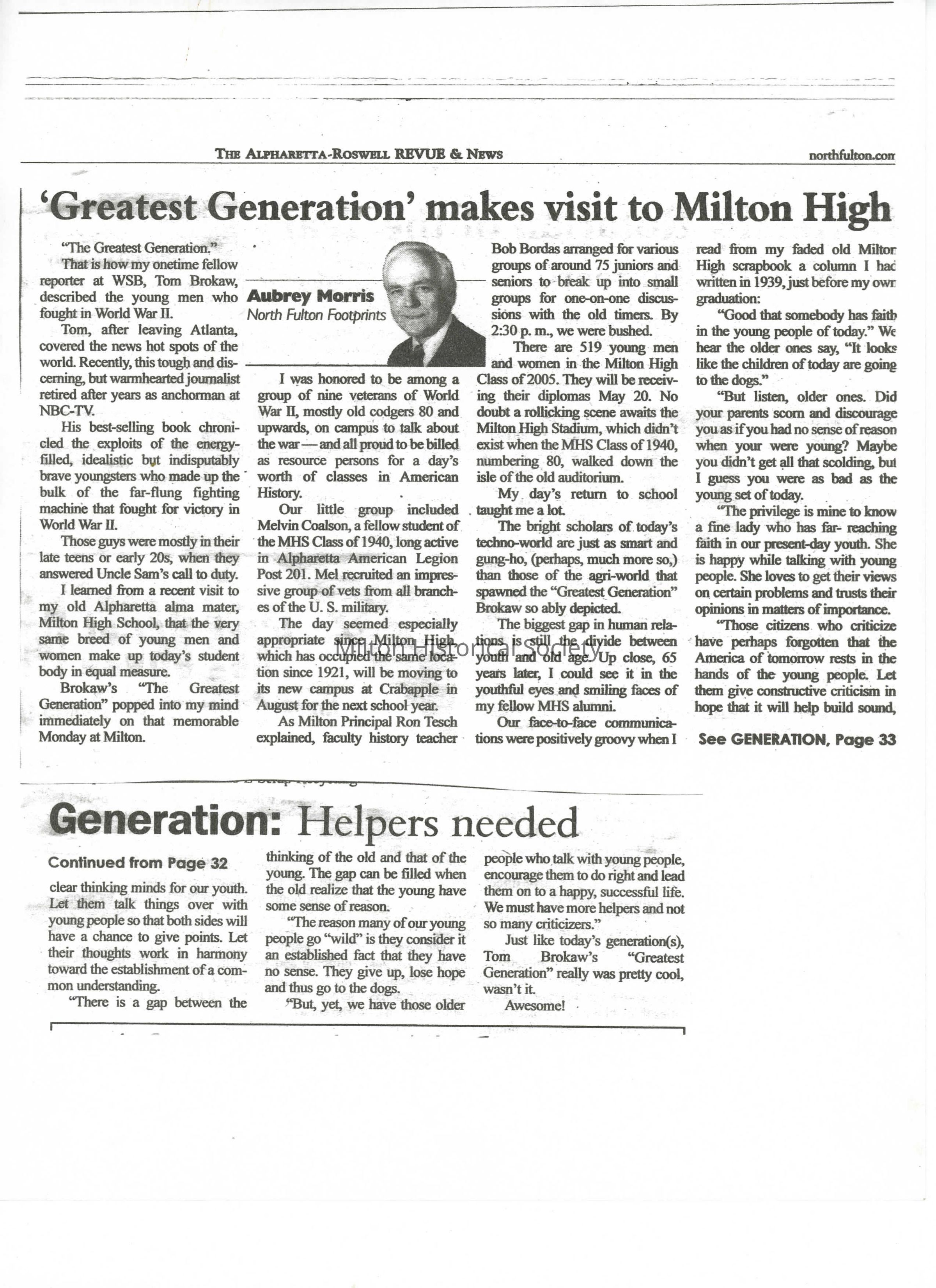 In 2005, Aubrey and eight other MHS alumni who were also WW2 veterans were asked to address MHS seniors. This article has his reflections of the 2 generations.Acquisition