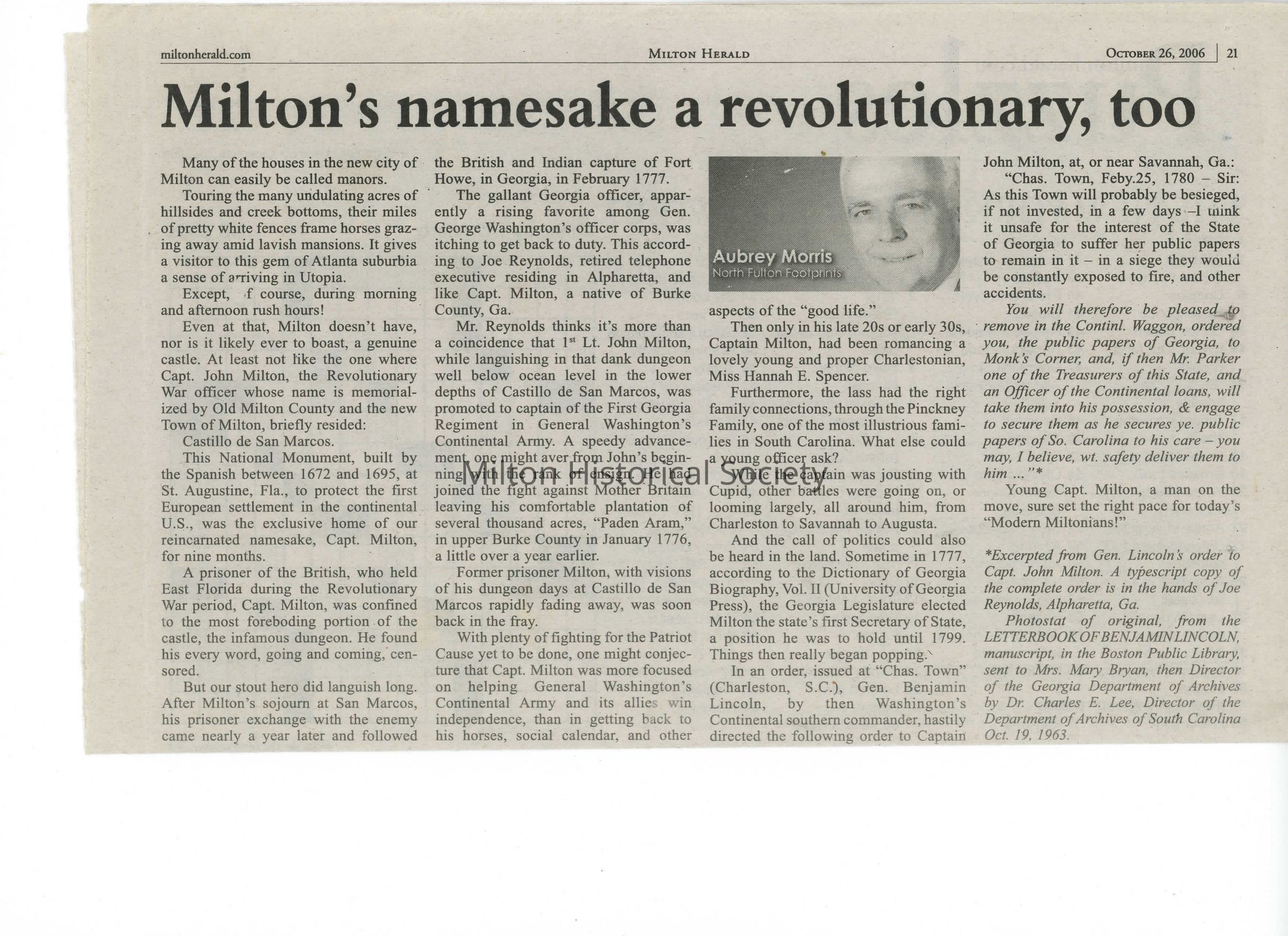 Article highlighting John Milton as a prisoner during the Revolutionary War and orders to save state of Georgia records from the British.Context