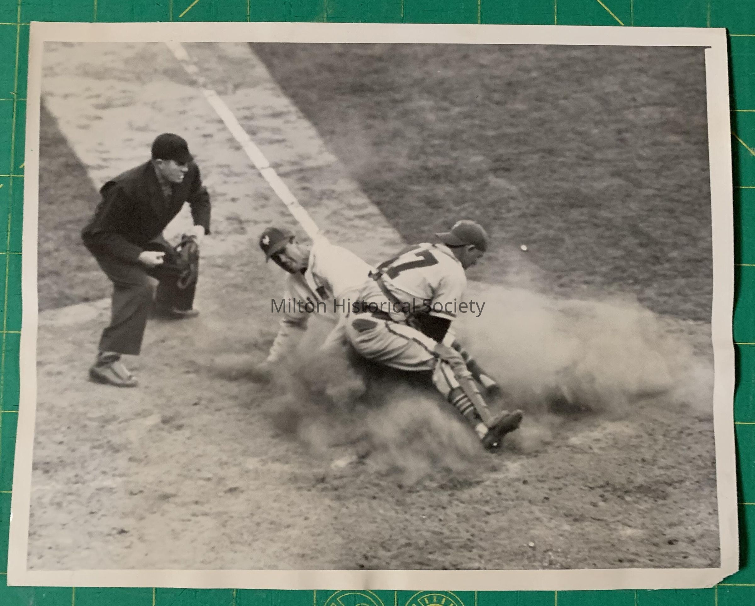 Black and white of a play at the plate following a bunt at the Polo fields April 16, 1946.Context