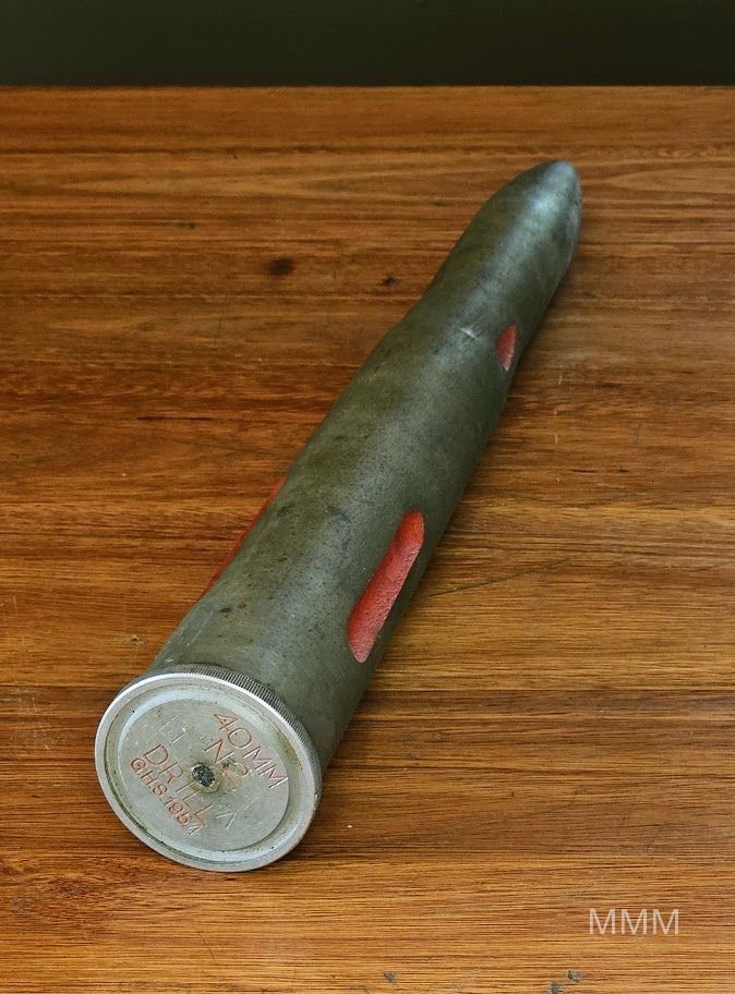 "40MM N2 GHS 1954" on the base indicate it's a 40mm N2 Bofors Drill Round manufactured by G.H.S. in 1954.