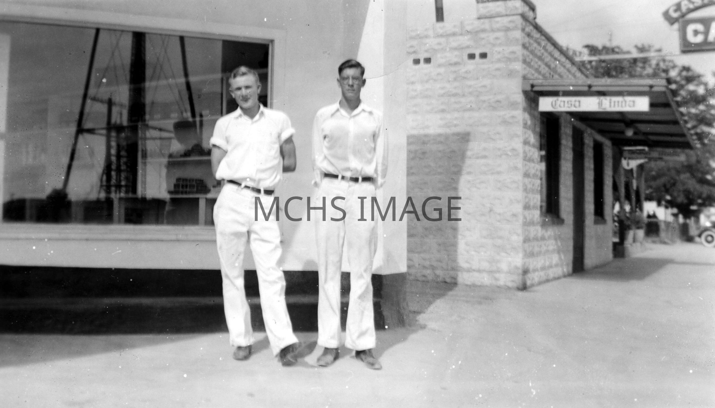 Service Station employees at 5th and Front St. with Casa Linda Café in the background. Don Shelton (L) and Bill Casson (R) standing in in front of Elmer Graves Service Station. 1940Collection