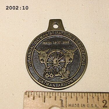 Bronze medal with hole to attatch a chain, face of the coin has the words "1st ANNUAL OATMAN ST PATRICKS RENDEZVOUS" "OATMAN ARIZONA, MARCH 15-17-2002" images of burros, a wheel, a cactus and a Route 66 shield appear on the face, the obverse has the number???? Memento of Black powder shoot.Collection