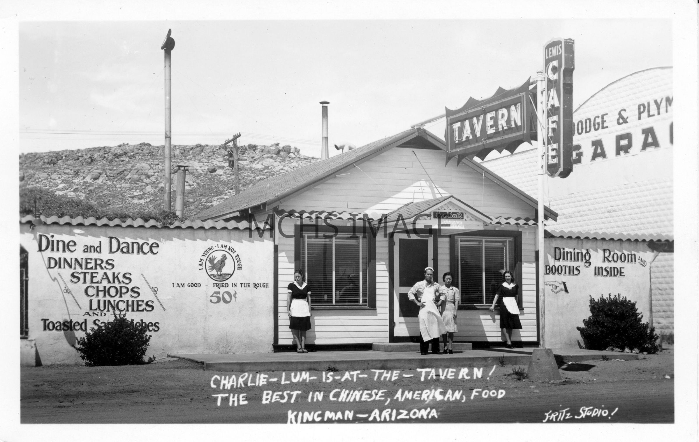 The Lewis Café and Tavern on Route '66 between 6th and 7th Streets. Charlie Lum, in the center of the postcard photo, came to Kingman from China in 1922 to work in his Grandfather's White House Café . Charlie opened his own restaurant, The Jade, around 1951 and was engaged in various other local enterprises over the years. His well respected family members are still community business leaders in Kingman.Other Names and Numbers