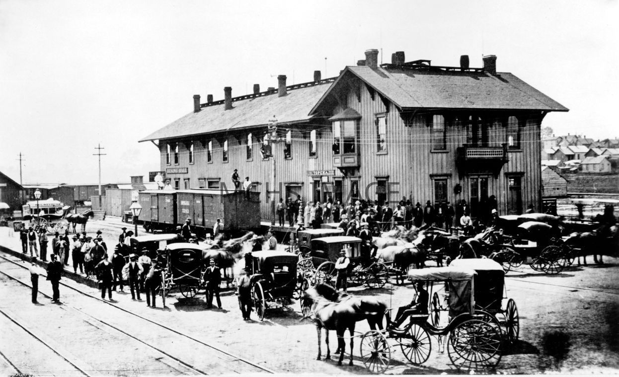A, T and Santa Fe Depot, Topeka, Ks. 1880, Harvey House with horses and buggies