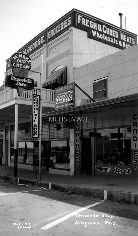 The original Chocolate Shop, next door to I.M. George's Market. The Chocolate Shop featured lunches, fountain service, candies, Coca- Cola and "We Make Our Cream" on a ice cream cone shaped sign. West side of 4th Street between Beale St. & Front Street.Collection