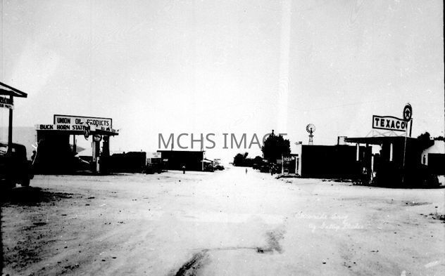 Looking south. L-R: Buck Horn's Union 76 Service Station (in 1995, fire station). Garage. Desert Inn Café, Mrs. Battles, owner. Across to right: Shep's establishment (owner: c.J.Shapiro; Chloride Café (owner: Hom Gong); Texaco Service StationOther Names and Numbers