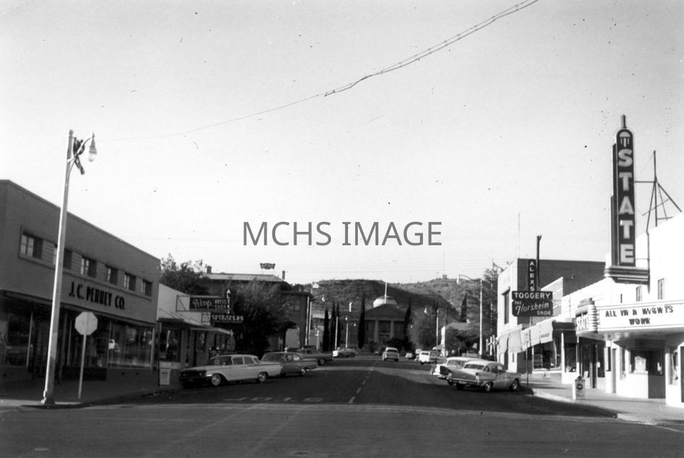 "In downtown Kingman, Arizona, looking North towards Mohave County Court House Carlos Elmer Photo". J.C. Penney building on the left. State Theater and Alex Toggery on the right. The County Courthouse is in the center of the photo at the end of the street.Collection