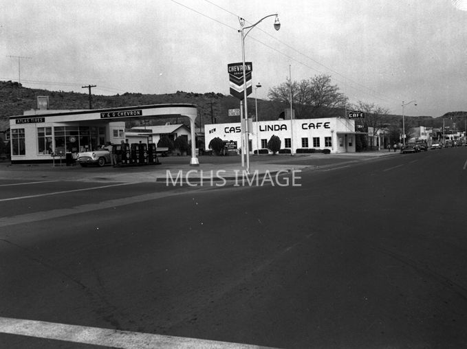 Exterior photograph of the Casa Linda Café taken in 1957, located at 5th Street and Front (Andy Devine) Street, next door was V & G Chevron Station.Collection