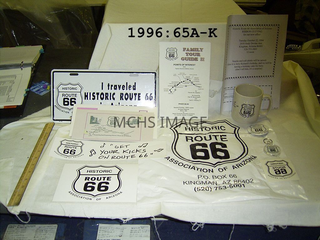 Advertising Packet-Route 66, (A). Aluminum License plate, white with black lettering "I TRAVELED HISTORIC ROUTE 66 IN ARIZONA." with Route 66 logo. (B). Coffee mug, white china with black Route 66 logo. (C). 2 -1/2" metal, pin back badge with logo. (D) 3" window decal with logo. (E) 7-1/2" decal logo. (F) Bumper sticker, logo & slogan "Get Your Kicks on