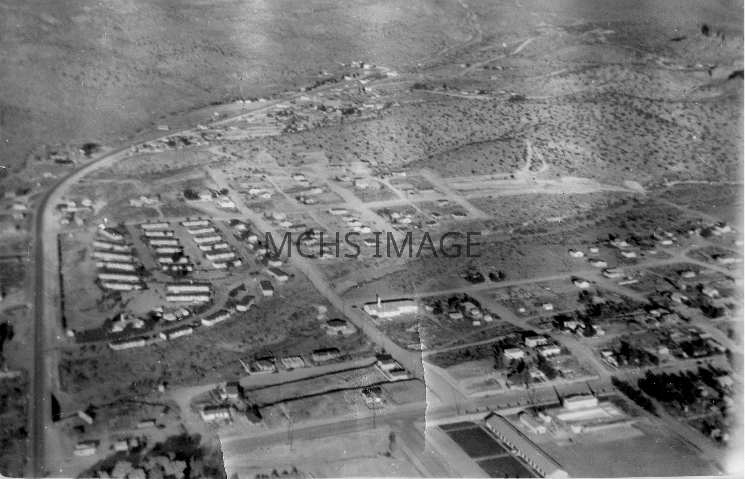 Highway 93 on left going up Coyote Pass, Barracks were from KAAF and used as apartments in mid 40's, it was called Vista Salona. Metcalfe Park on bottom left (trees showing, street showing is Grandview. Bottom right swimming pool and original Jr. HighOther Names and Numbers