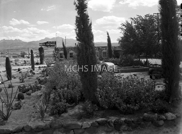Akron Motel Cottages advertises "Air Cooled". A profusion of desert landscaping with rock borders designate a plaza or park area. W. Hwy 93Collection