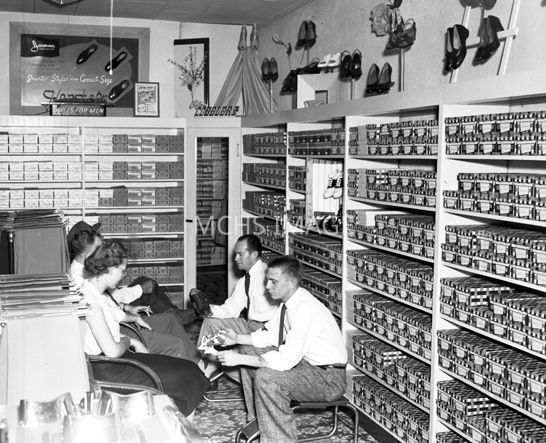 Two men are showing shoes to 3 customers, one of the salemens is Jim Ford. There is a nice display of men and women's shoes as well as racks of men's trousers. Alex's Toggery sold shoes and good quality men's clothing. Alex's Toggery was on North 4th Street just north of the State Theater on Beale. The two salesmen are identified as LtoR: Marion Hilty and Bill Sipe Sr.Collection