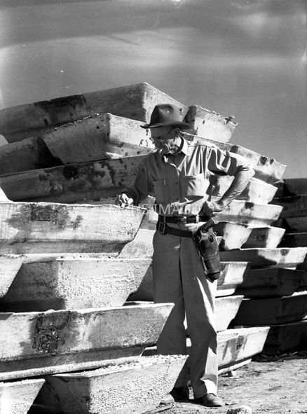 Aluminum ingots, end product of scrap airplanes at Kingman Army Air Field in 1946. Note: sidearm on man standing in photo.Collection